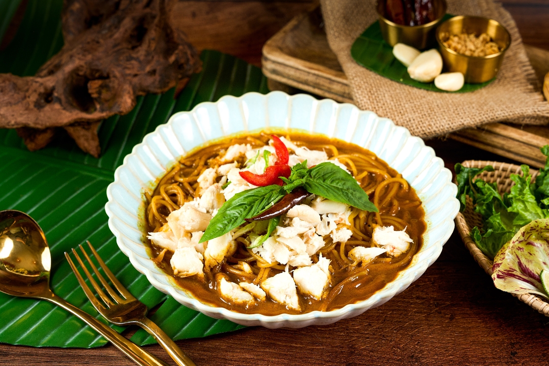 Northern Thai-style chicken drumstick served with egg noodles in a rich chicken curry broth, topped with red onions, scallions and crispy egg noodles (Mild Spicy).