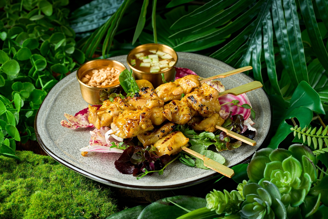 Marinated free-range chicken skewers with lemongrass, turmeric, and coriander, served with peanut sauce and cucumber vinegar.