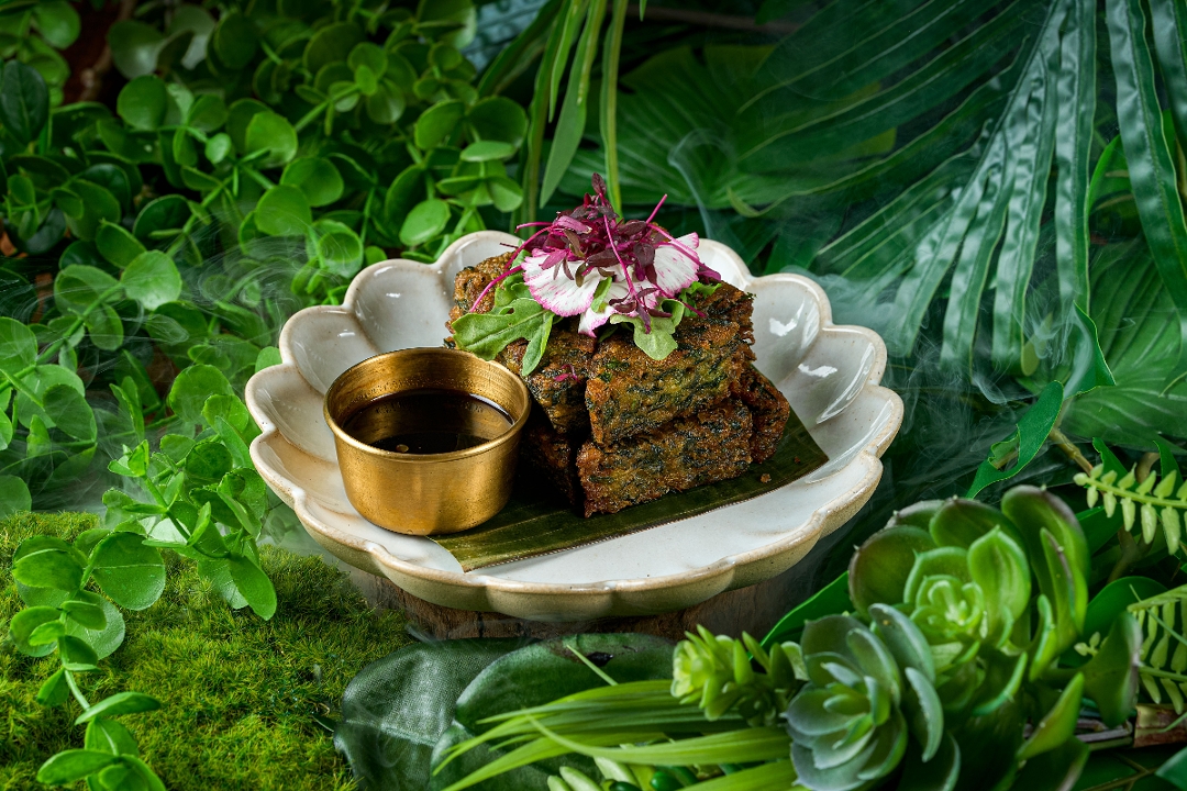 Deep-Fried Wontons filled with ground chicken and Thai herbs, served with infused soy sauce.