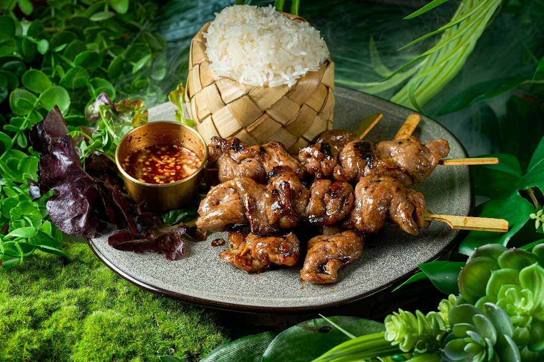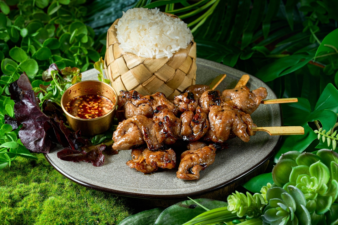 Thai-style grilled pork skewers served with homemade Thai sauce (Jim-Jaew) and sticky rice.