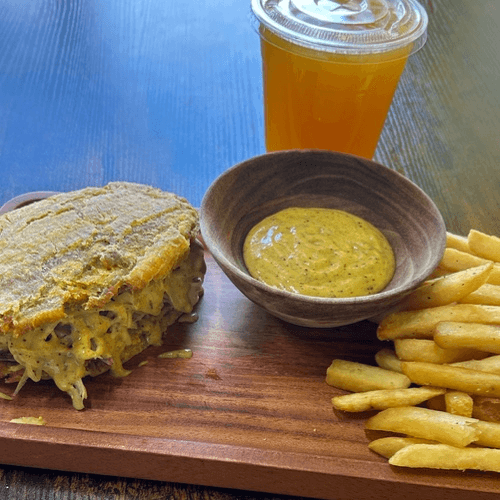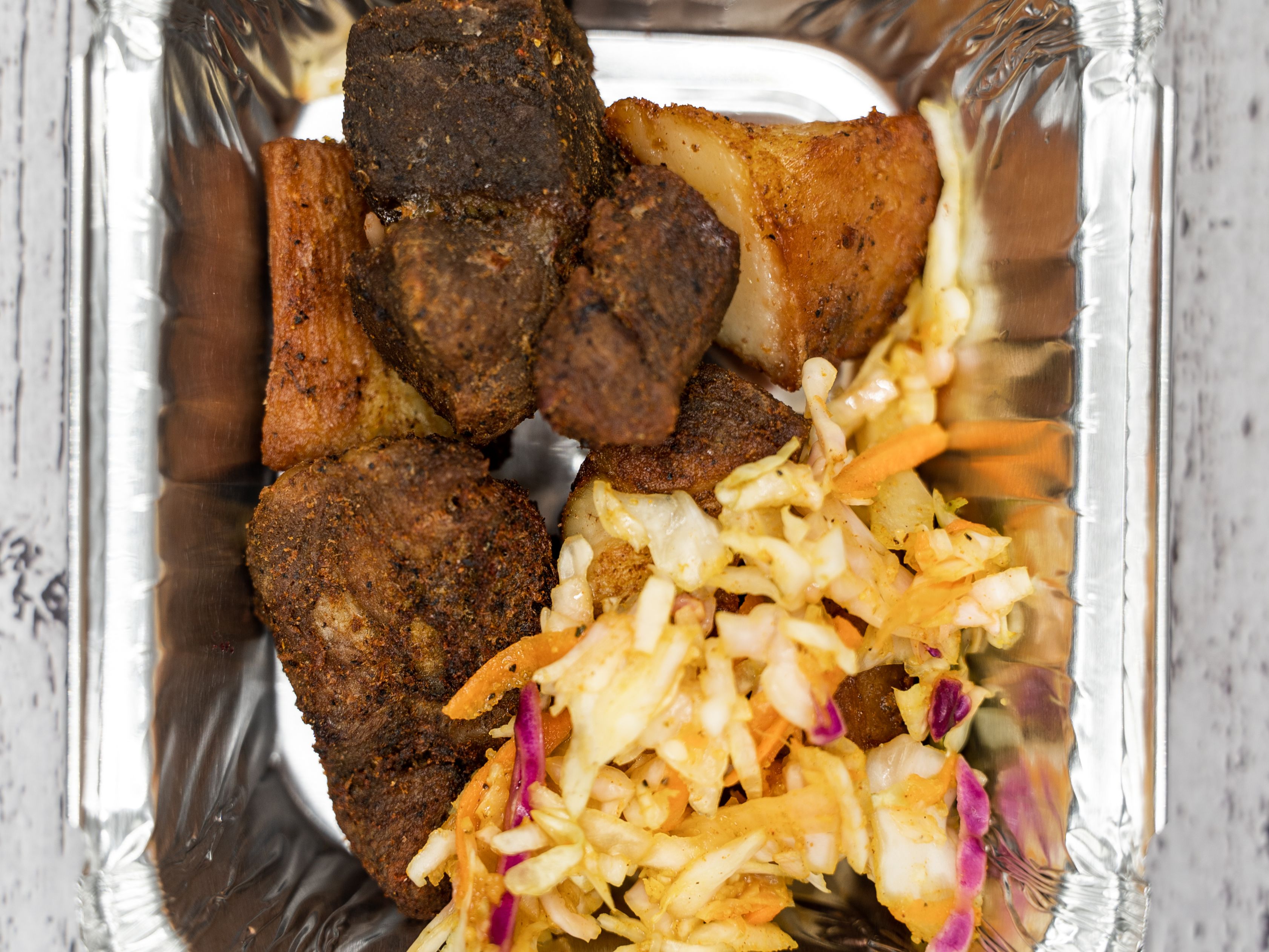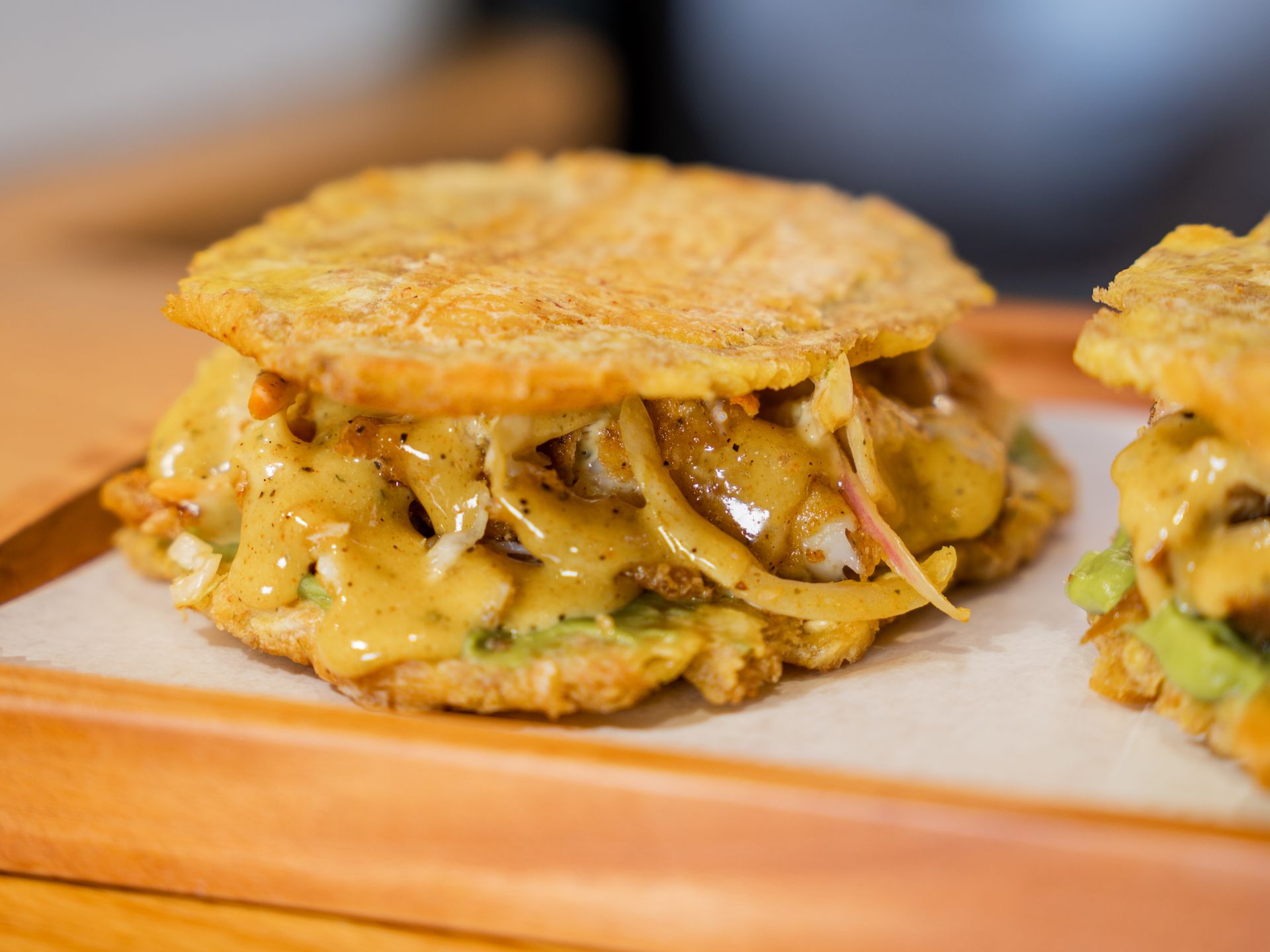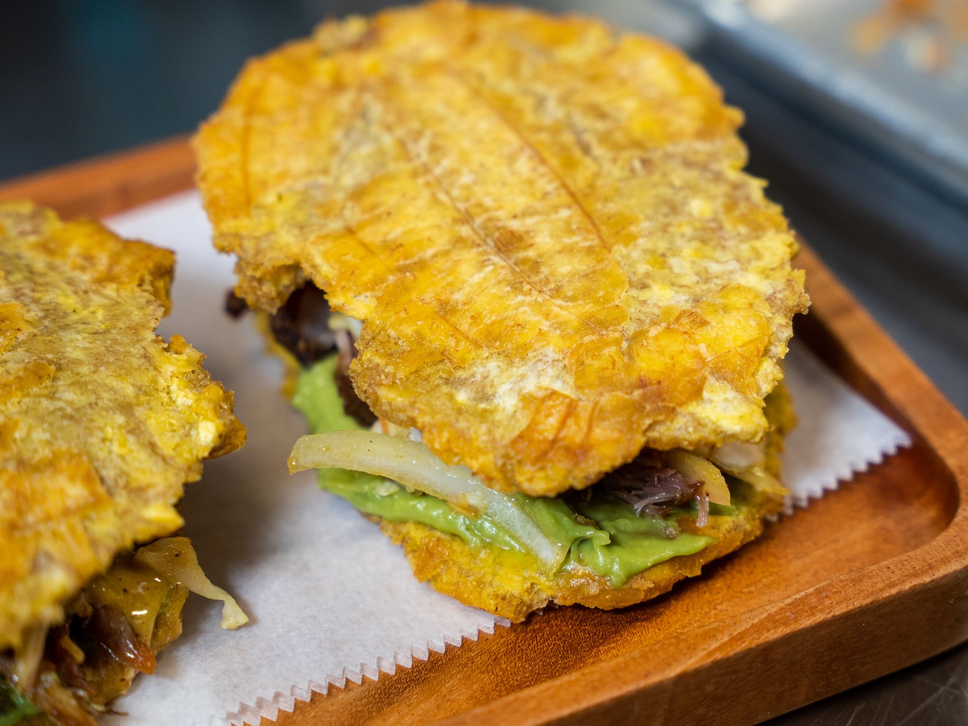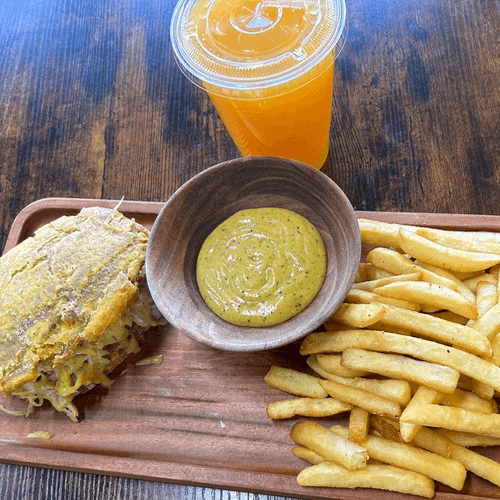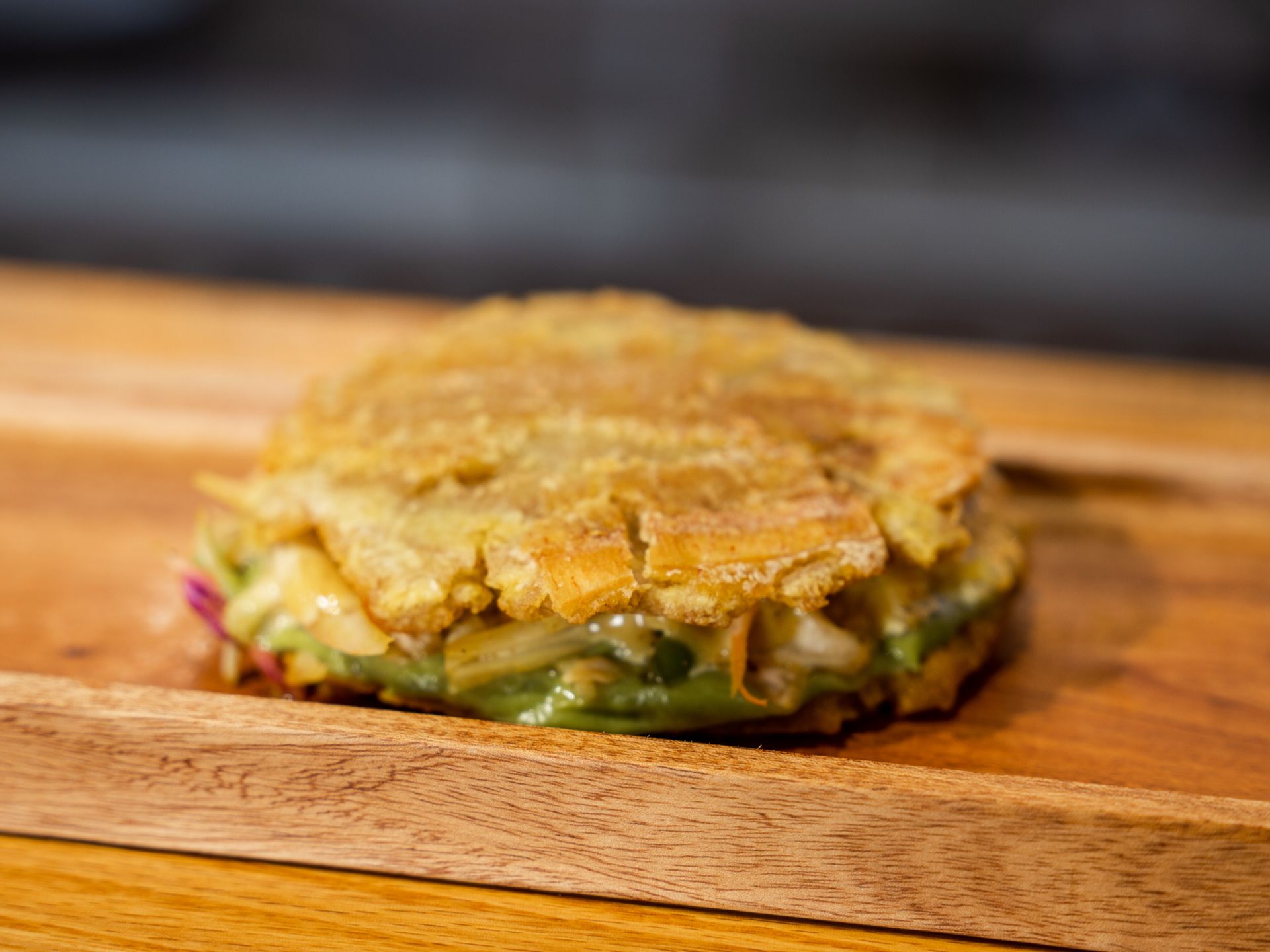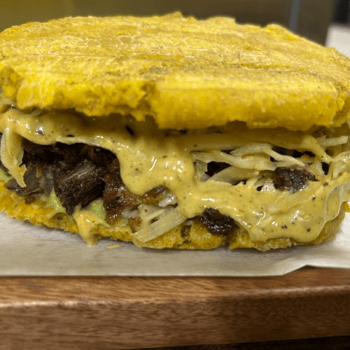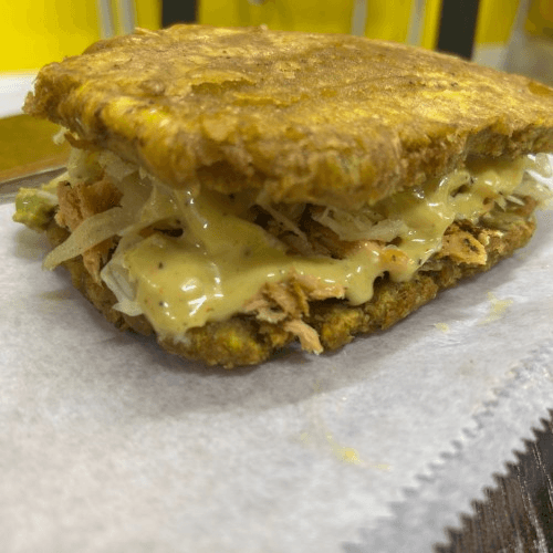 Made With Tasty Crispy Fried Plantain, Juicy Fried Pork, Avocado, House Pikliz, and House special Honey BBQ Sauce