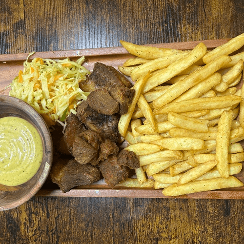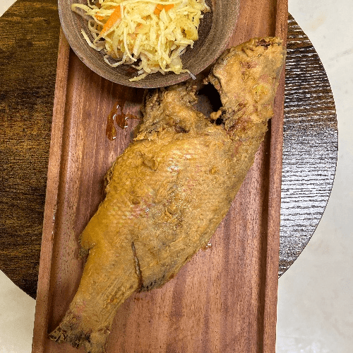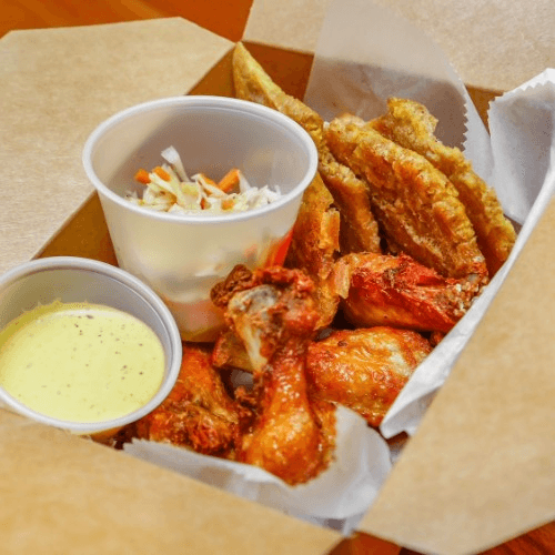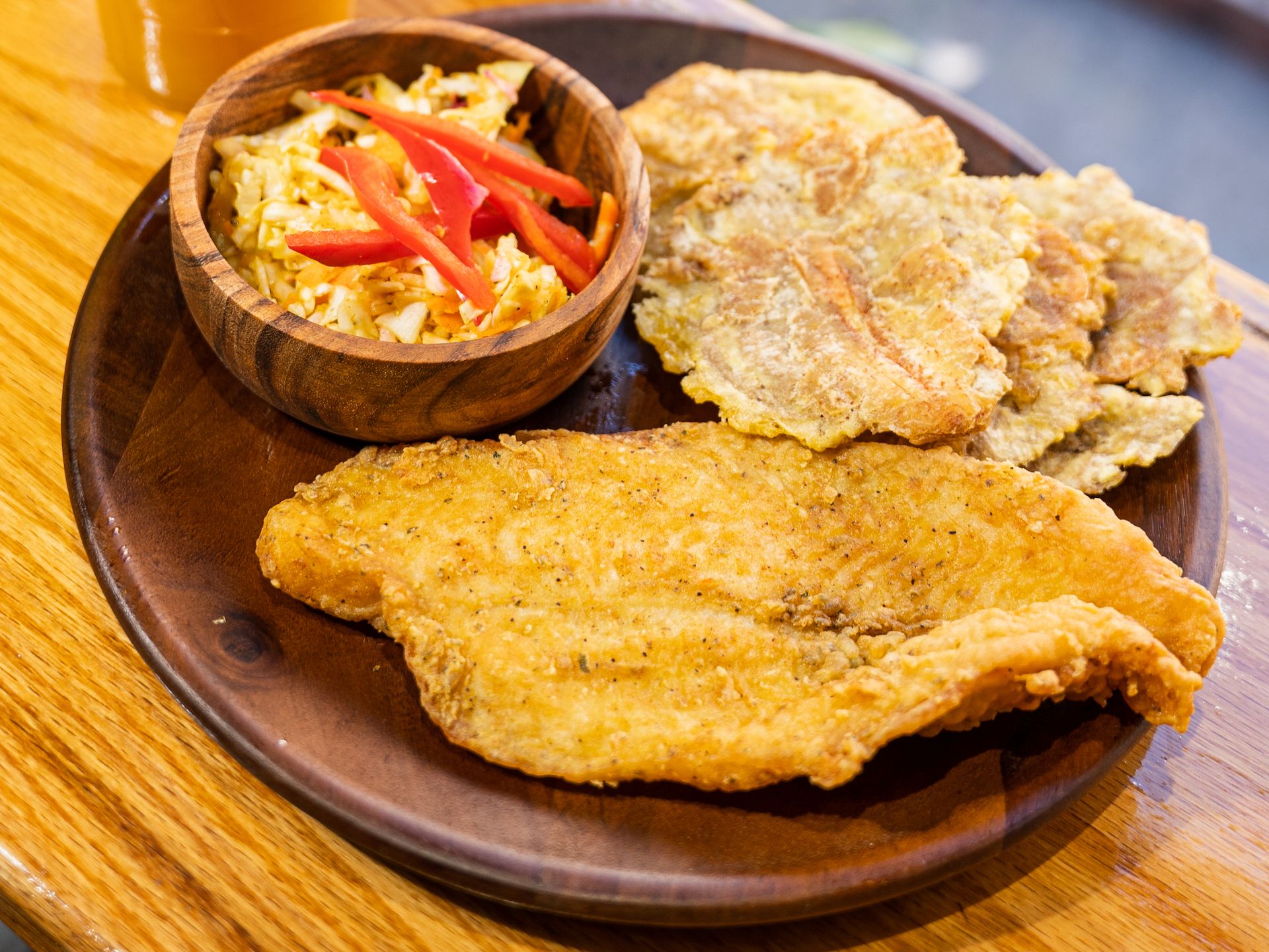 Made With Tasty Crispy Fried Plantain, Juicy Fried Swai fillet Fish, Avocado, House Pikliz, and House special Honey BBQ Sauce