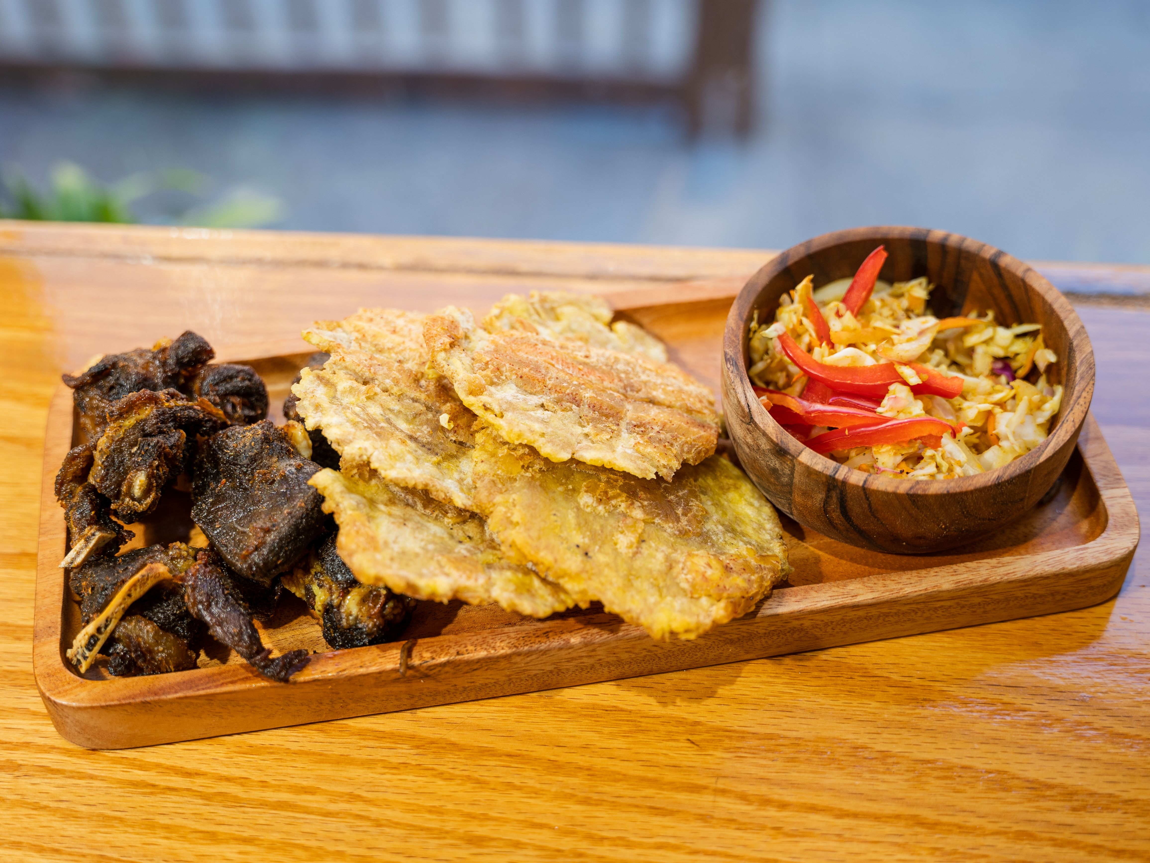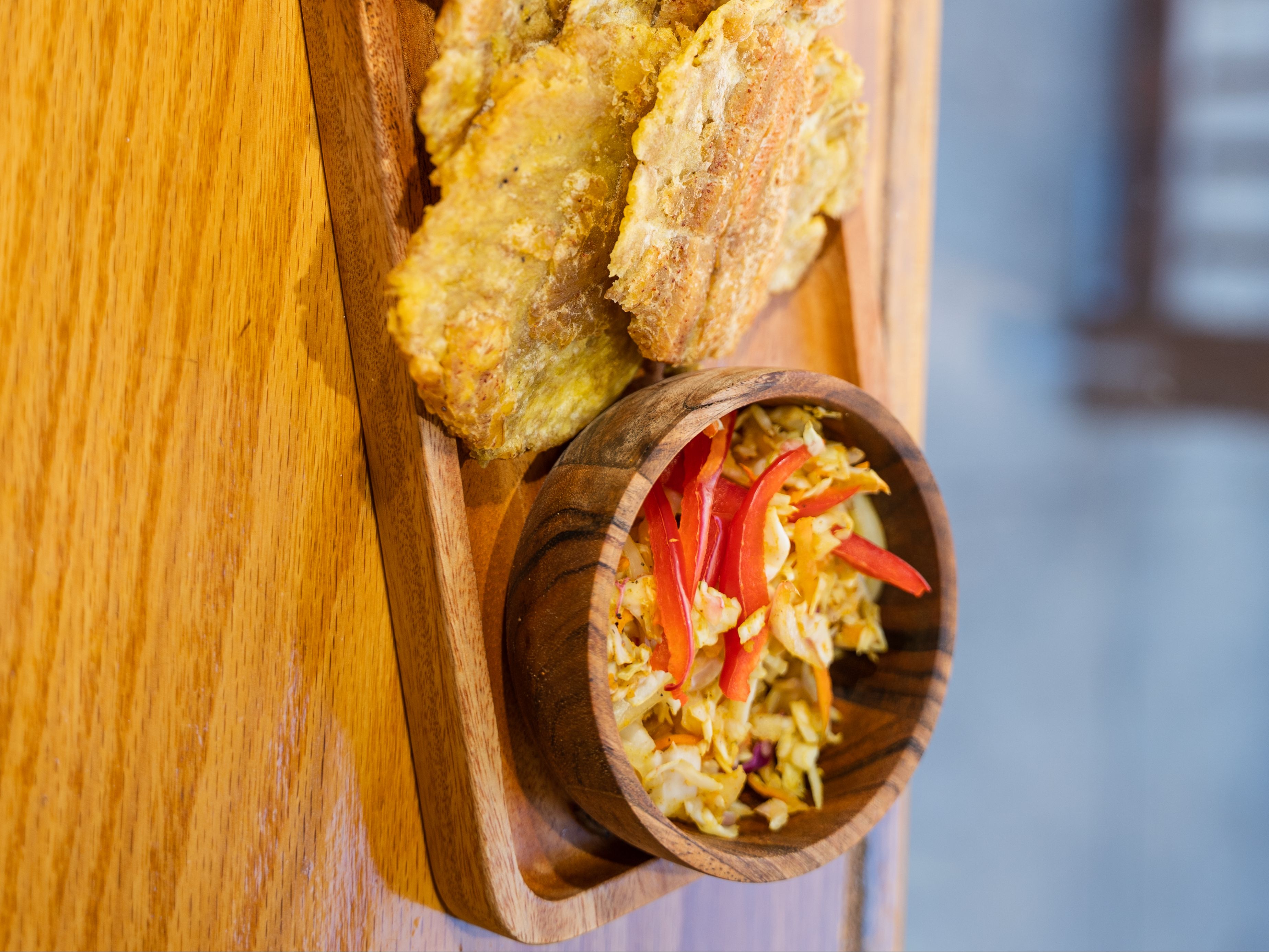 Crispy Fried plantain, avocado, house pikliz, and house signature sauce