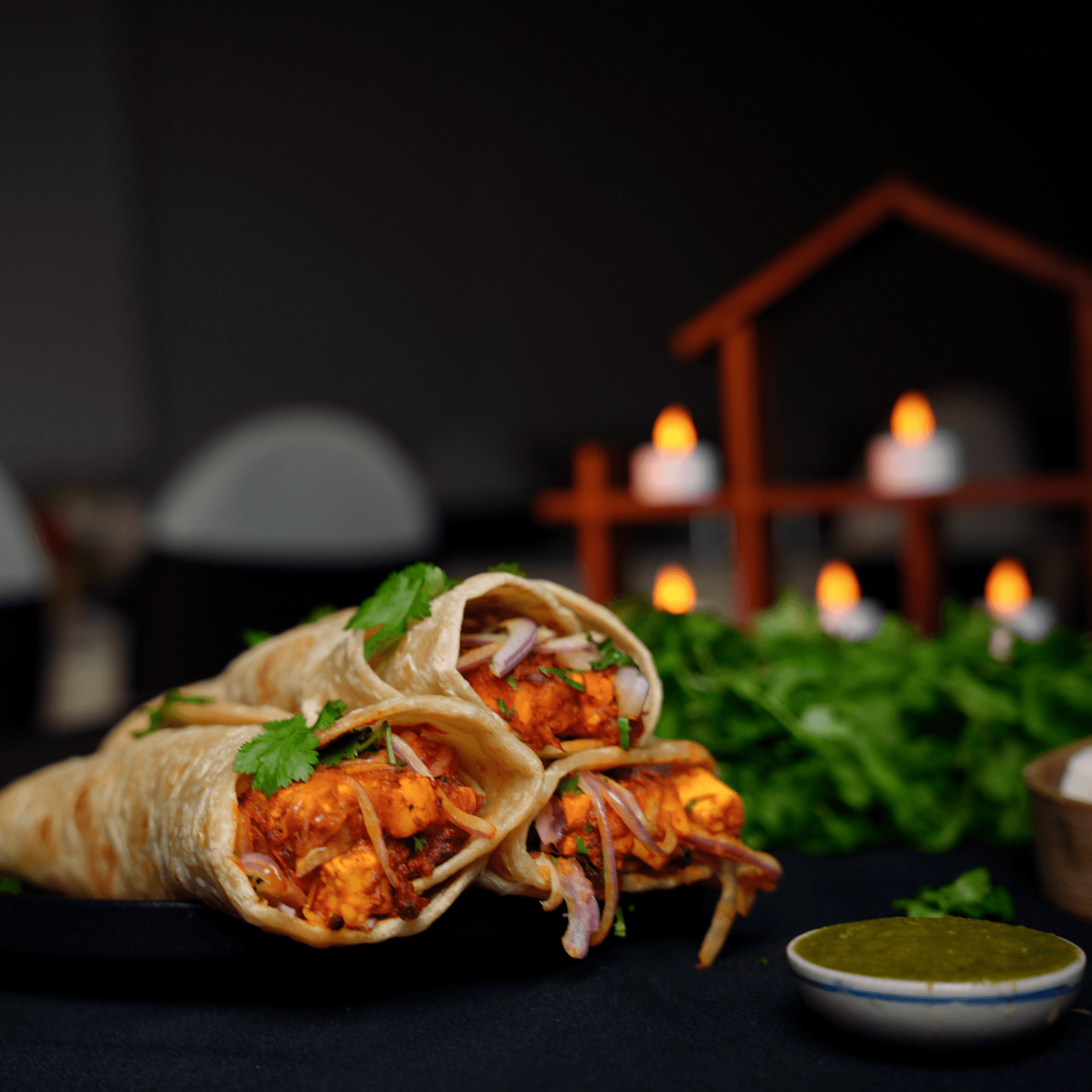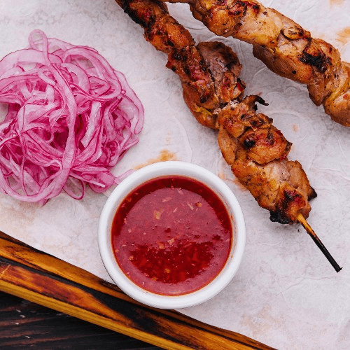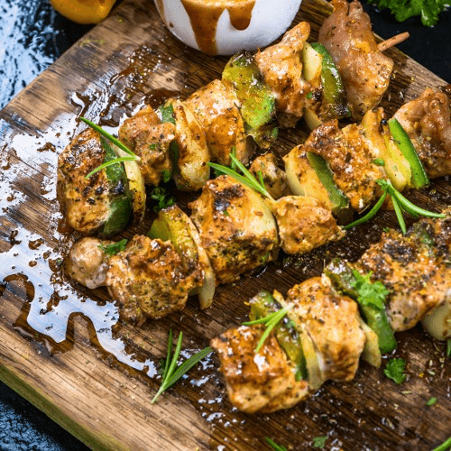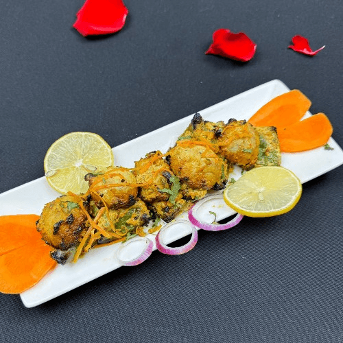Grilled boneless chicken pieces seasoned with ghost chilies, Indian herbs, and spices