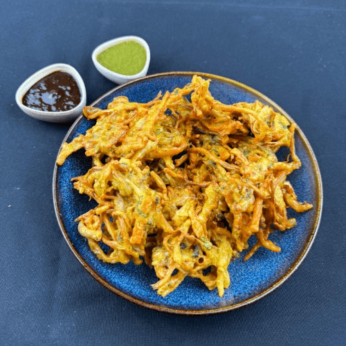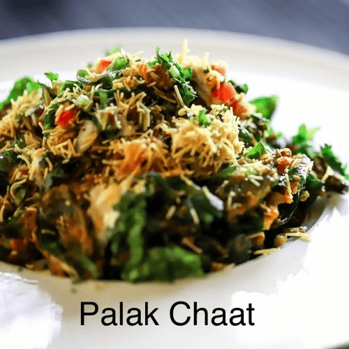 Crispy spinach topped with onions, cilantro, and tomatoes. Crispy, crunchy, spicy, and tangy Indian snacks seasoned with tamarind sauce, chaat masala, and lentil noodles