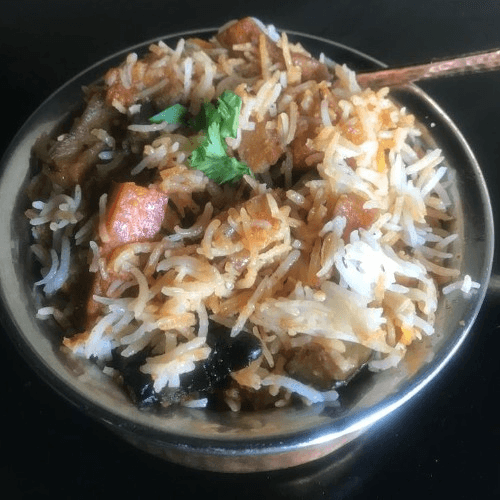 Vegan. Vegetables (peas, carrots, potato, zucchini, and cauliflower) cooked in basmati rice. Dumpukth style