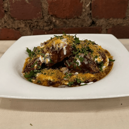 Savory potato mash topped with crispy eggplant rounds. Crispy, crunchy, spicy, and tangy Indian snacks seasoned with tamarind sauce, chaat masala, and lentil noodles