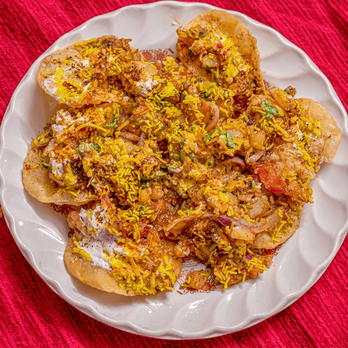 Potato patty topped with onion, cilantro, and tomatoes. Crispy, crunchy, spicy, and tangy Indian snacks seasoned with tamarind sauce, chaat masala, and lentil noodles