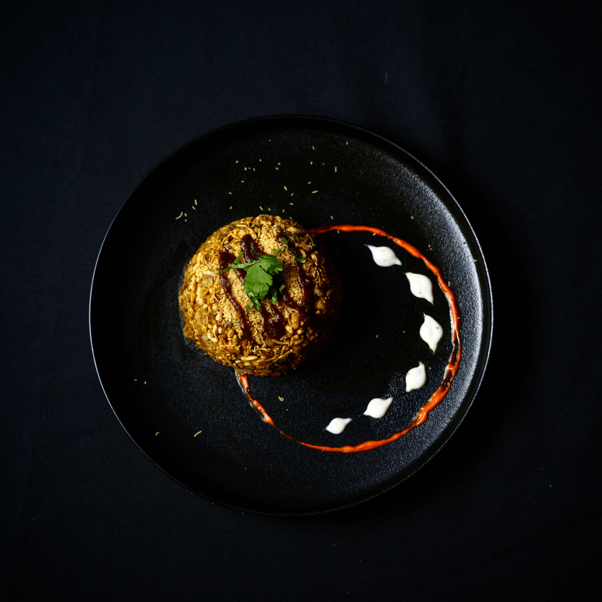 Vegan. Puffed rice and potato topped with onions and cilantro. Contains gluten. Crispy, crunchy, spicy, and tangy Indian snacks seasoned with tamarind sauce, chaat masala, and lentil noodles