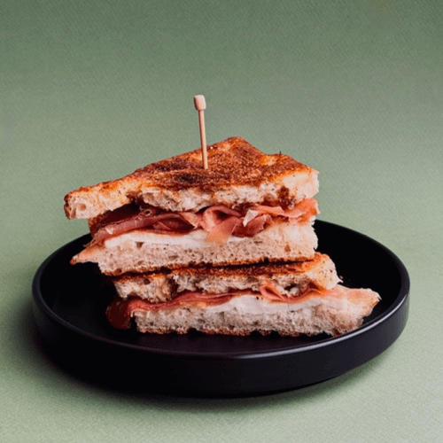 Truffle spread, mortadella with pistachio, arugula on Sourdough bread