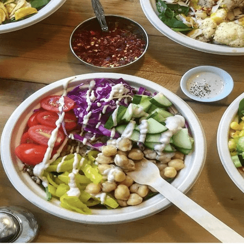 Quinoa and/or wild rice, spinach, chickpeas, tomatoes, cucumber, red cabbage, red onion, and banana peppers. Served with tahini lemon dressing on the side.
