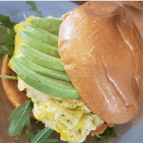 Brioche bread, scrambled eggs, parmesan cheese, avocado, arugula and a splash of chipotle vinaigrette