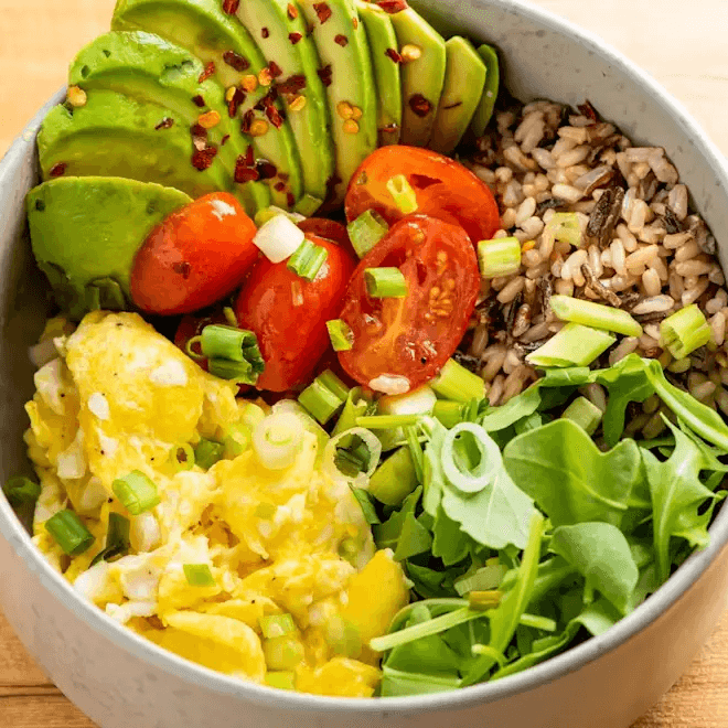 A warm bowl with wild rice, scrambled eggs, arugula, cherry tomatoes, avocado, and scallions. Comes with chipotle vinaigrette and cilantro lime dressings on the side