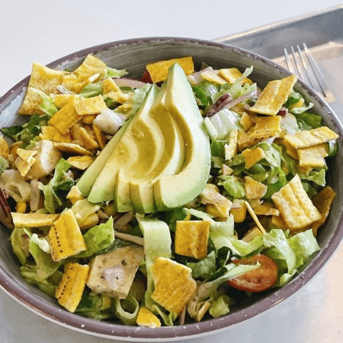 Romaine, grilled chicken, avocado, tomatoes, corn, red onion, and plantain chips. Served with cilantro lime dressing