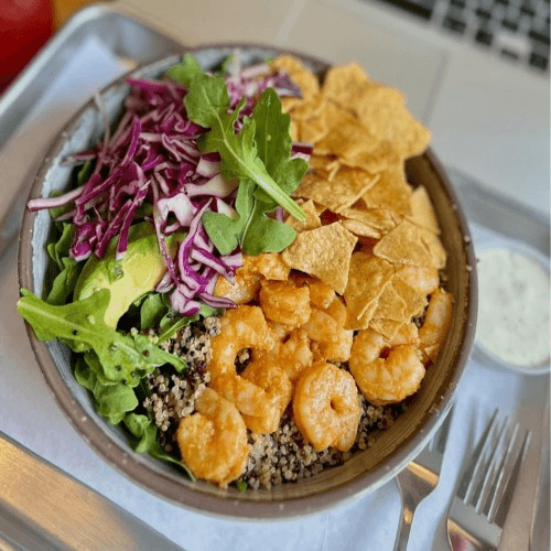 Quinoa and/or wild rice, arugula, garlic shrimp, red cabbage, avocado and tortilla chips. Served with cilantro lime + chipotle dressings on the side.