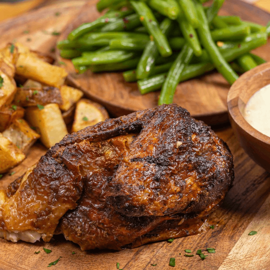 Baked to perfection, juicy daily baked, marinated with peruvian flavors