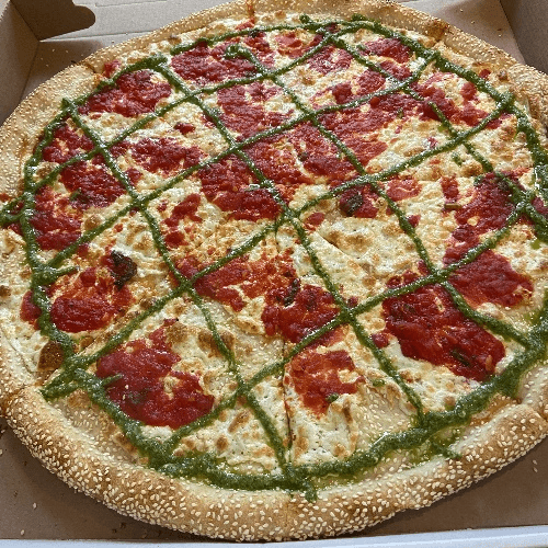 Sesame seed crust, pesto, fresh mozzarella, marinara sauce