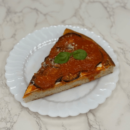 Crispy eggplant topped with fresh mozzarella and marinara on a thick pan crust