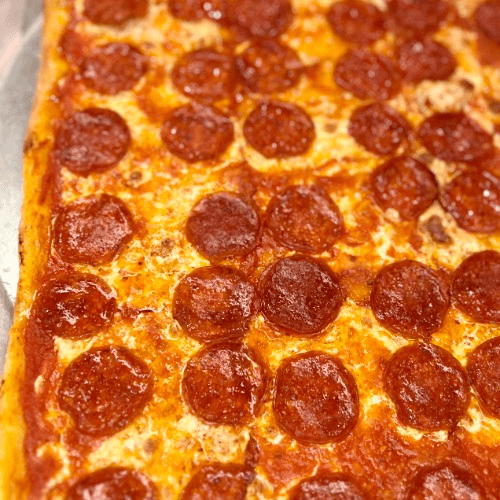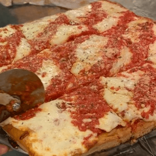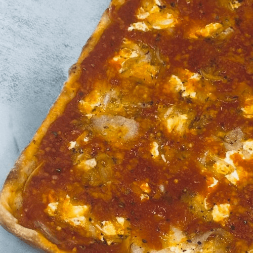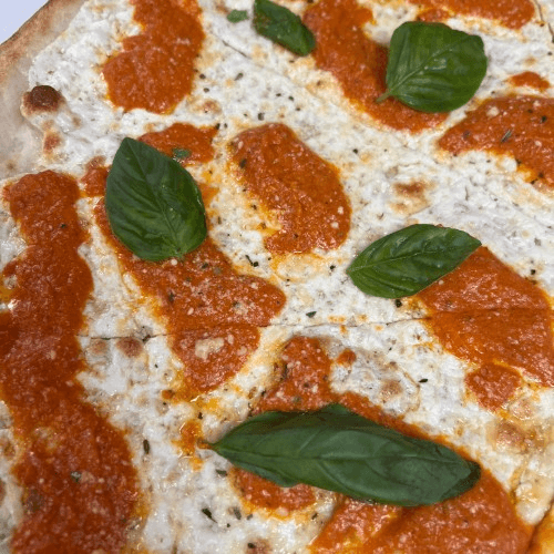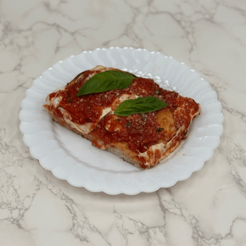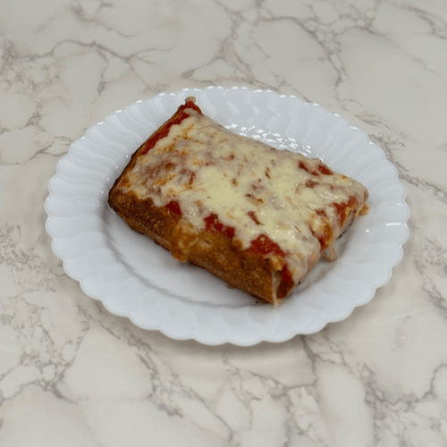 Thick, airy crust, baked to golden crisp topped with rich tomato sauce and bubbly melted mozzarella . A Pino classic square