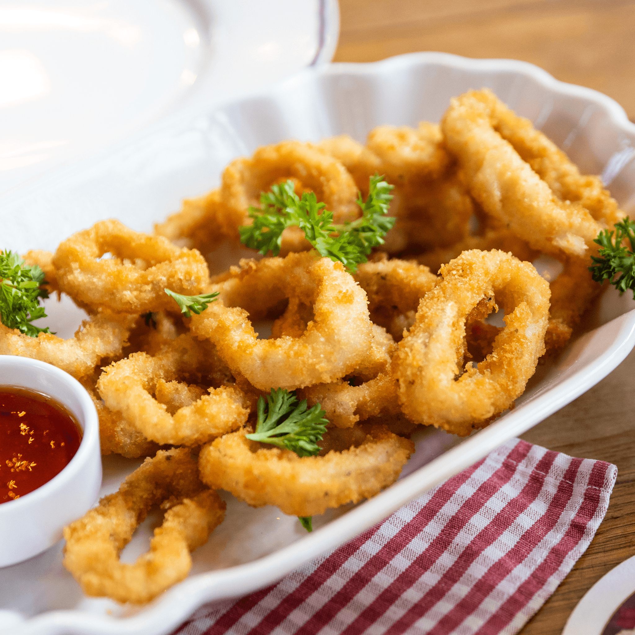 Lightly breaded and crispy fried calamari rings, served with marinara and lemon for the perfect bite.
