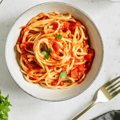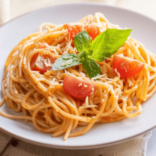 Succulent shrimp cooked in a bold, garlicky marinara sauce, served over pasta