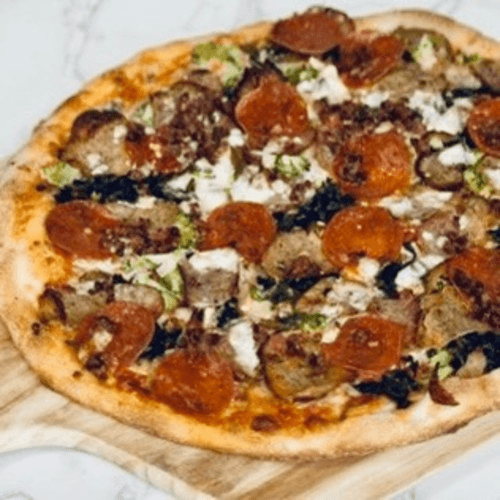 Pepperoni, sausage, meatballs, bacon, spinach, mushrooms, onion & olives