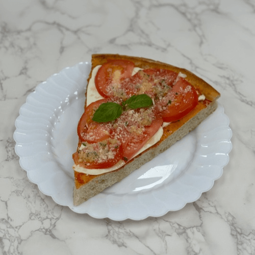 Combo of mozzarella, sliced tomatoes, and garlic on a golden pan crust