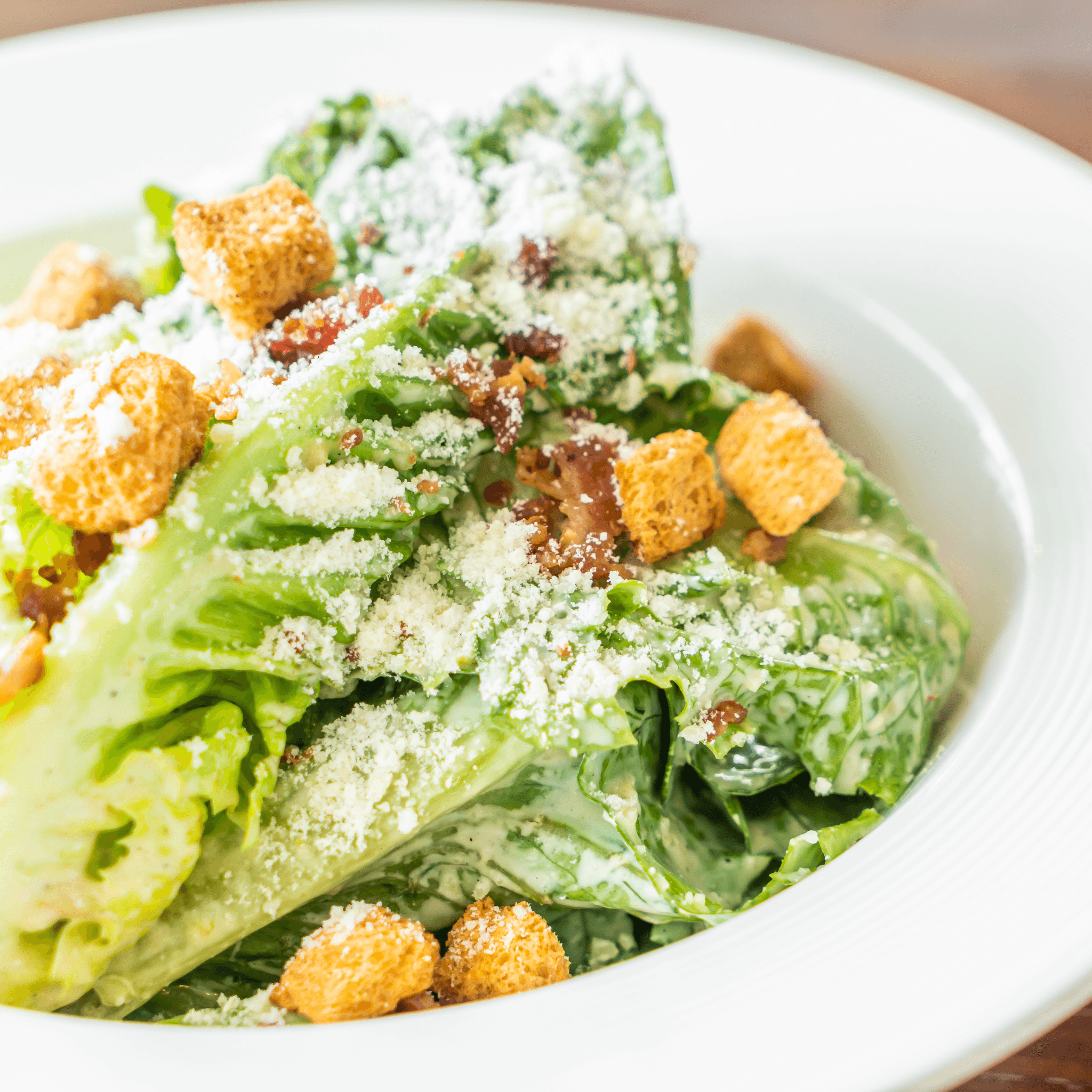 Crisp romaine lettuce tossed with Caesar dressing, crunchy croutons, and grated Romano cheese.