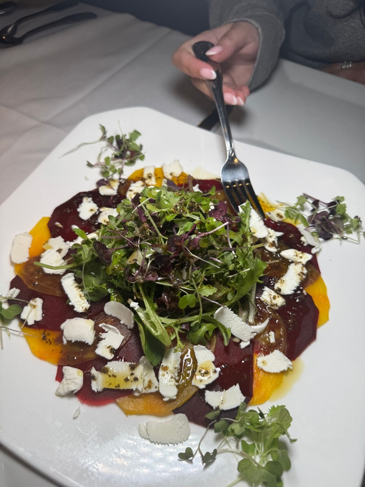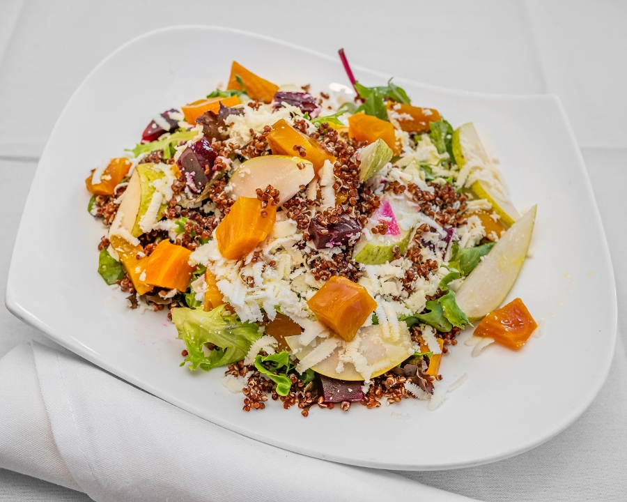This sweet & savory winter salad is a delicious start to any meal. Roasted red and golden beets, sliced pears, toasted walnuts, feta, mixed greens & quinoa.