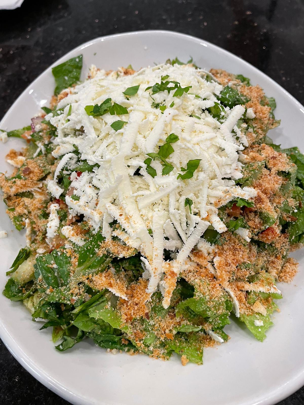 Romaine, tomatoes, cucumber, red onion, red bell pepper, parsley, za’atar, breadcrumbs, feta, fresh lemon, extra virgin olive oil