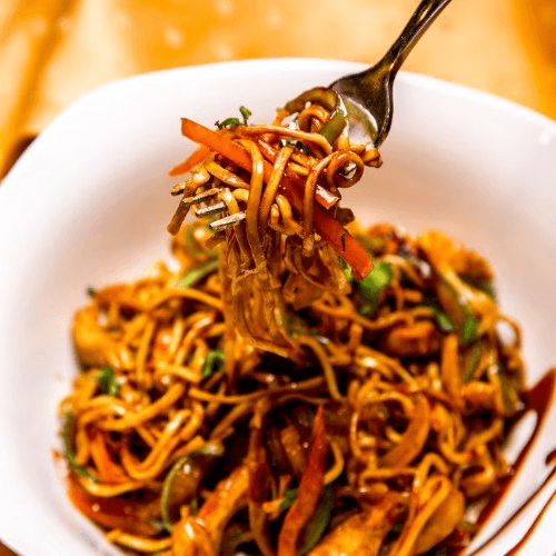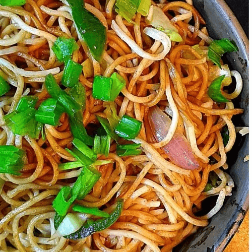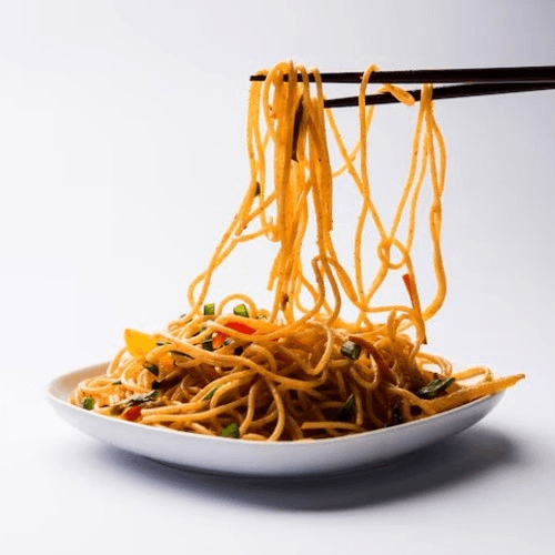 Spicy. Noodles tossed with finely diced vegetables & Schezwan sauce