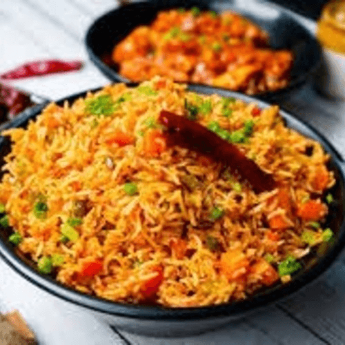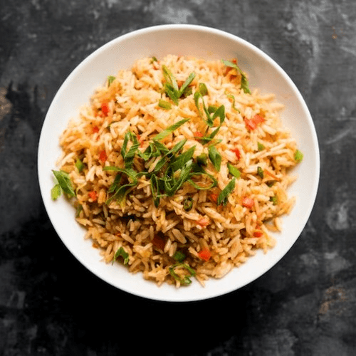 Spicy. Rice tossed with finely diced vegetables & Schezwan sauce