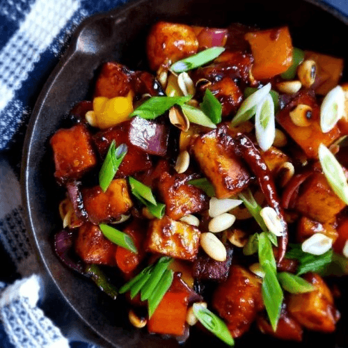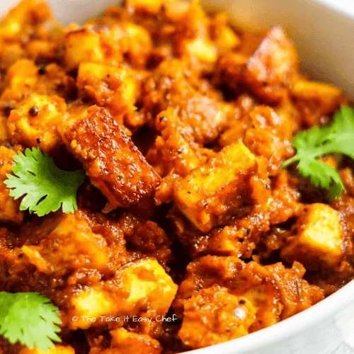 Spicy. Stir fried cottage cheese tossed in Schezwan sauce