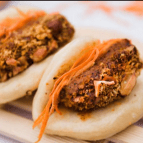 Non spicy. Deep fried crispy vegetable in steamed bao drizzle with sriracha mayo