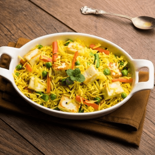 The provided combo image is for reference purposes only. Rice, tossed with finely diced vegetables. Gravy, spicy cottage cheese, bell pepper prepared with chilli garlic & soya sauce