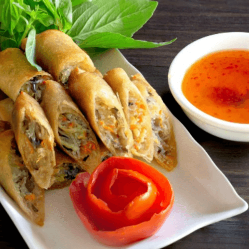 Non spicy. Deep fried rolls stuffed with mix vegetables & seasoning. Served with hot garlic sauce