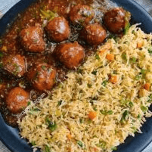 The provided combo image is for reference purposes only. Rice tossed with finely diced vegetables. Gravy, mix vegetable balls prepared in ginger, garlic, chilli & soya gravy