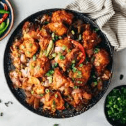 Dumplings filled with soft paneer and tossed in a fiery chili sauce