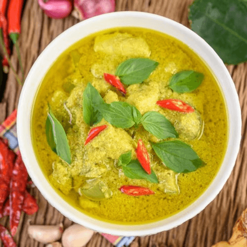Medium spicy. Coconut milk based spicy gravy cooked with exotic vegetables with Thai green paste