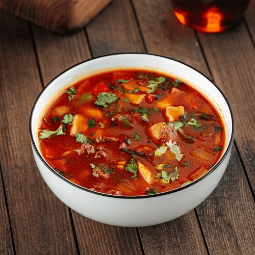 Medium Spicy. Bursting with seven colorful vegetables including beetroot for that vibrant red hue. This soup is a feast for the senses