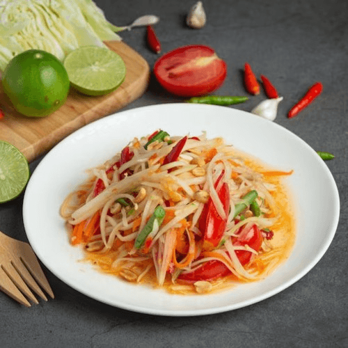 Spicy. Spicy classic Thai raw papaya salad in sweet spicy tangy dressing