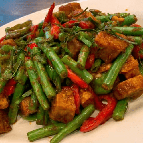 Bell pepper, string bean, long hot chill, onion Spice Level: Medium