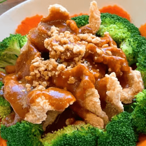 Sauteed sliced meat with garlic pepper sauce come with steamed broccoli and carrot