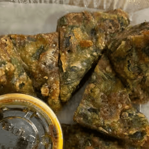 Crispy chive cake served with sweet chili sauce