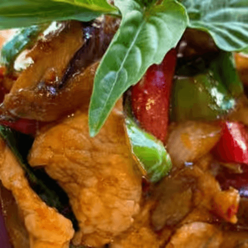 Coconut milk, bamboo shoot, bell pepper, long hot chill, eggplant, basil Spice Level: Medium
