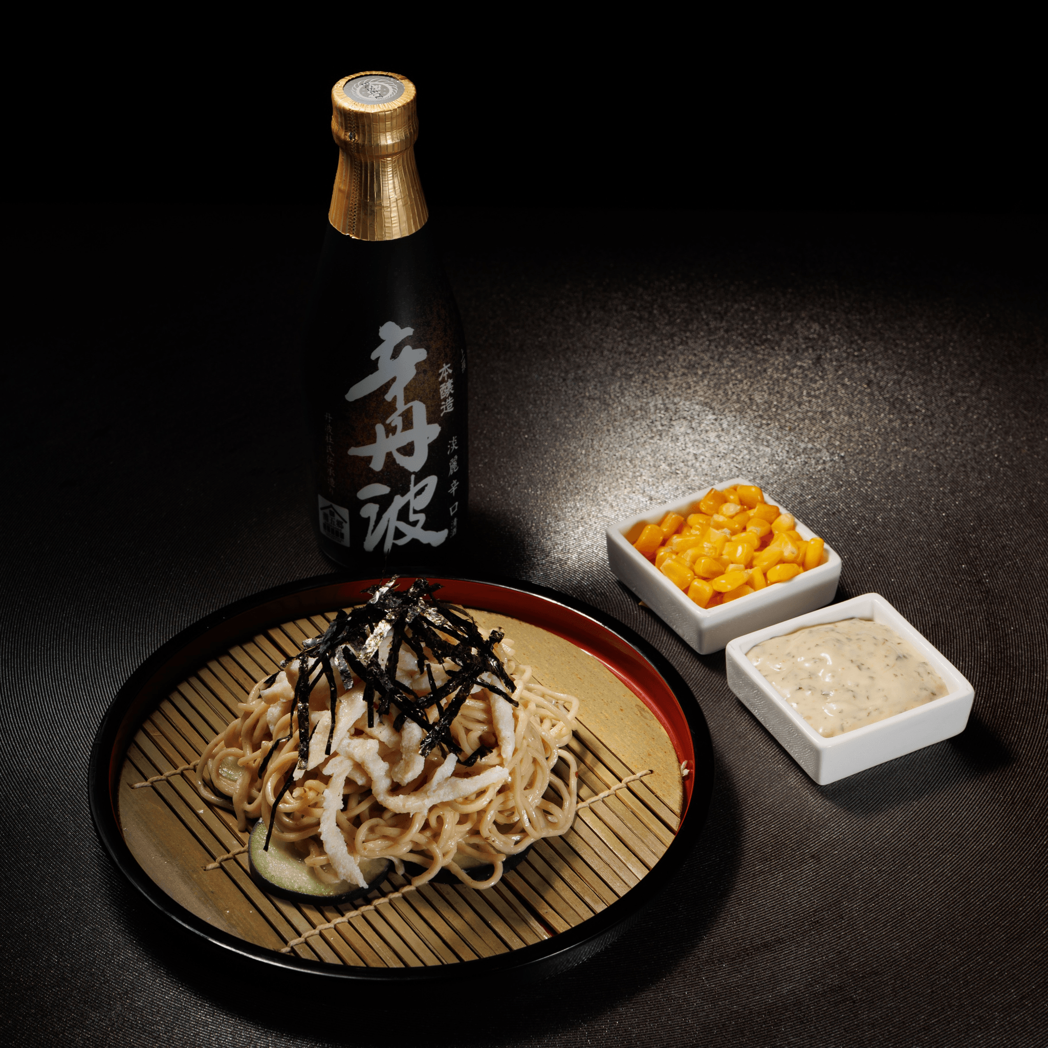 Sauteed ramen with chicken, jalapeno, fresh corn, Japanese wood ear mushroom, carrot, & Kogane yaki sauce with soft boiled egg & nori
