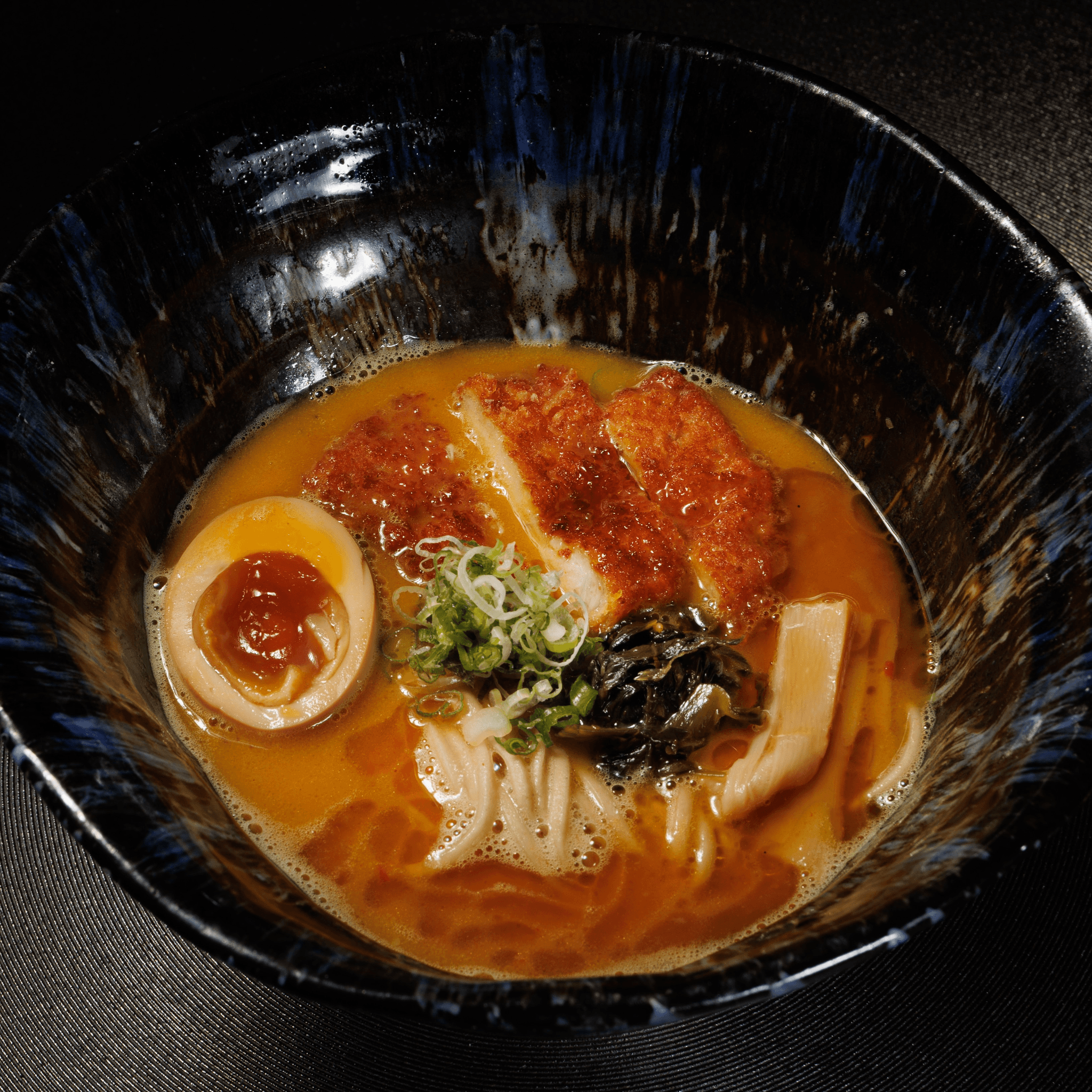 Pork bone & curry based broth, fried pork or chicken cutlet, soft boiled egg, menma, scallion, pickles, & black garlic oil