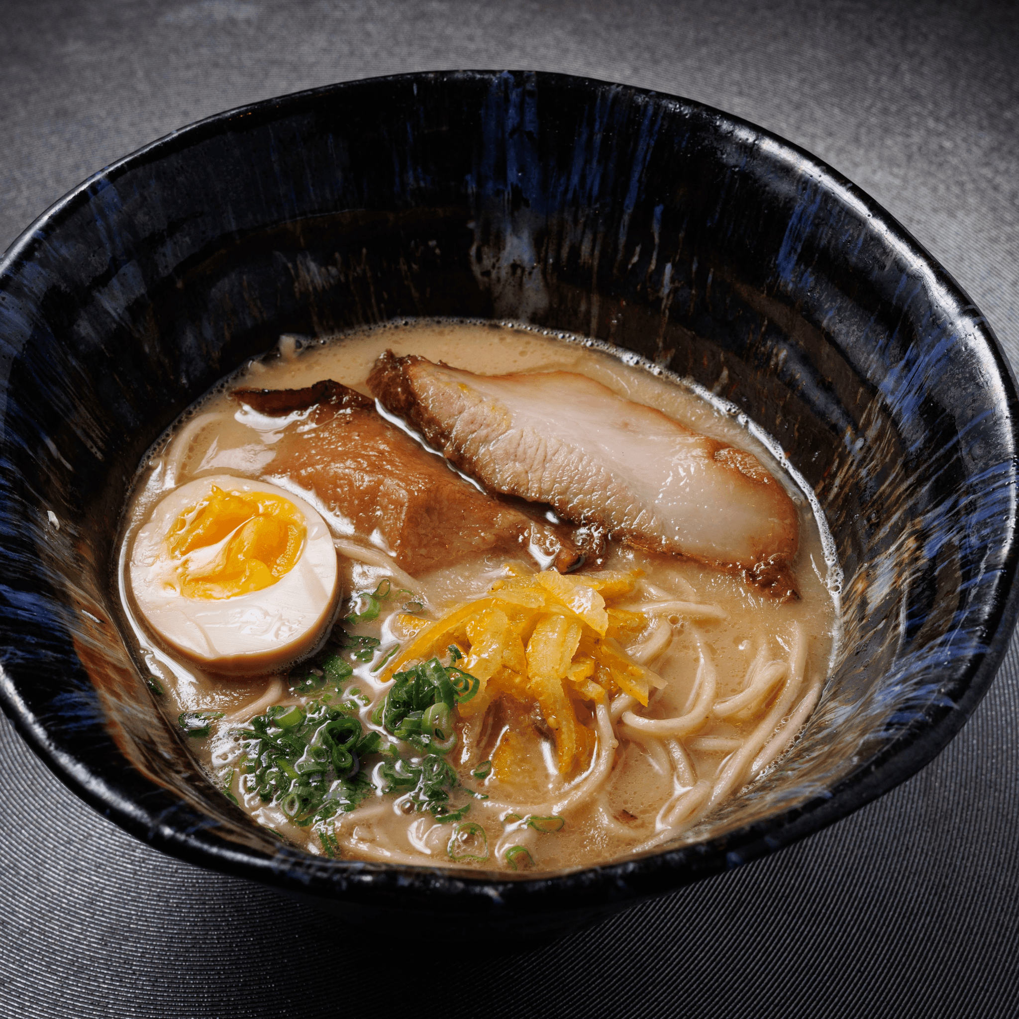 Pork bone based broth, braised pork belly, Japanese wood ear mushroom, menma, soft boiled egg, scallions, & black garlic oil