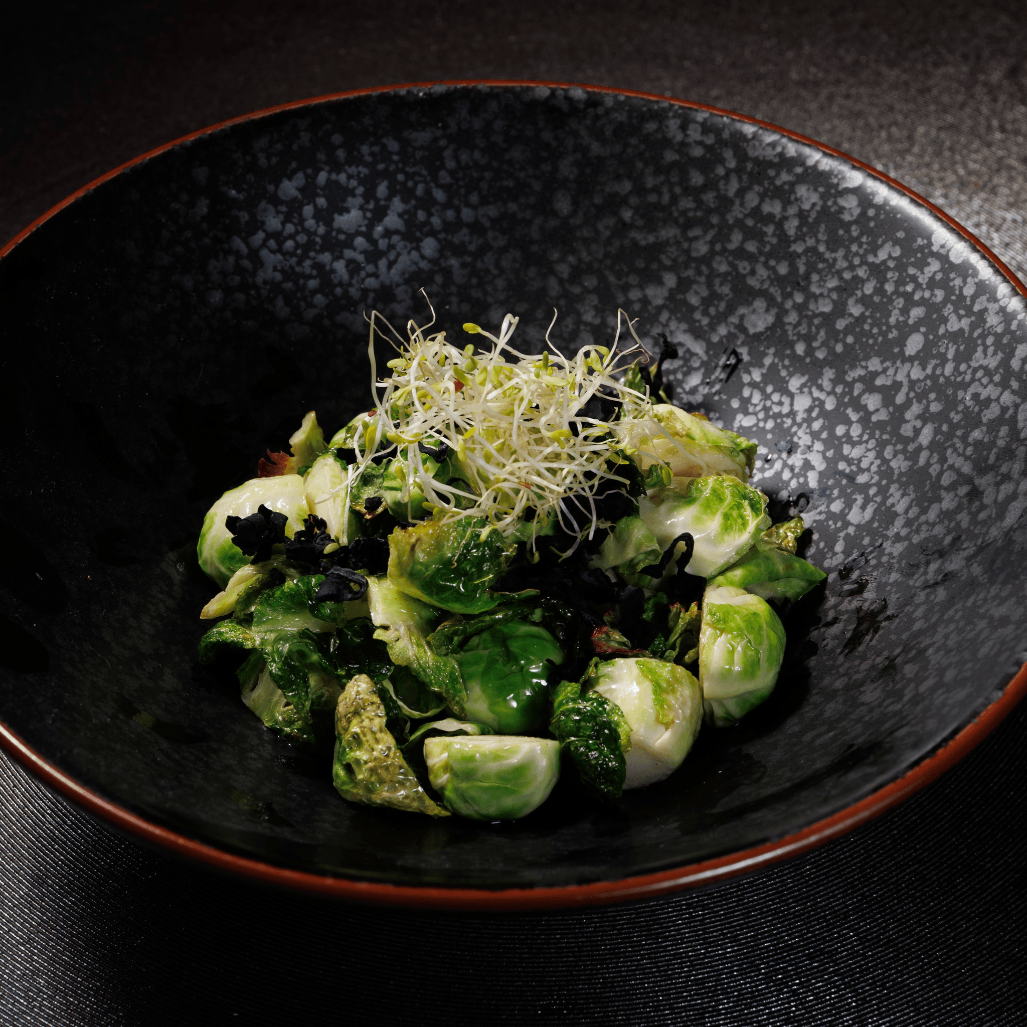 Sauteed Brussel sprouts, hijiki salad, and edamame with sake butter sauce, and soy sauce