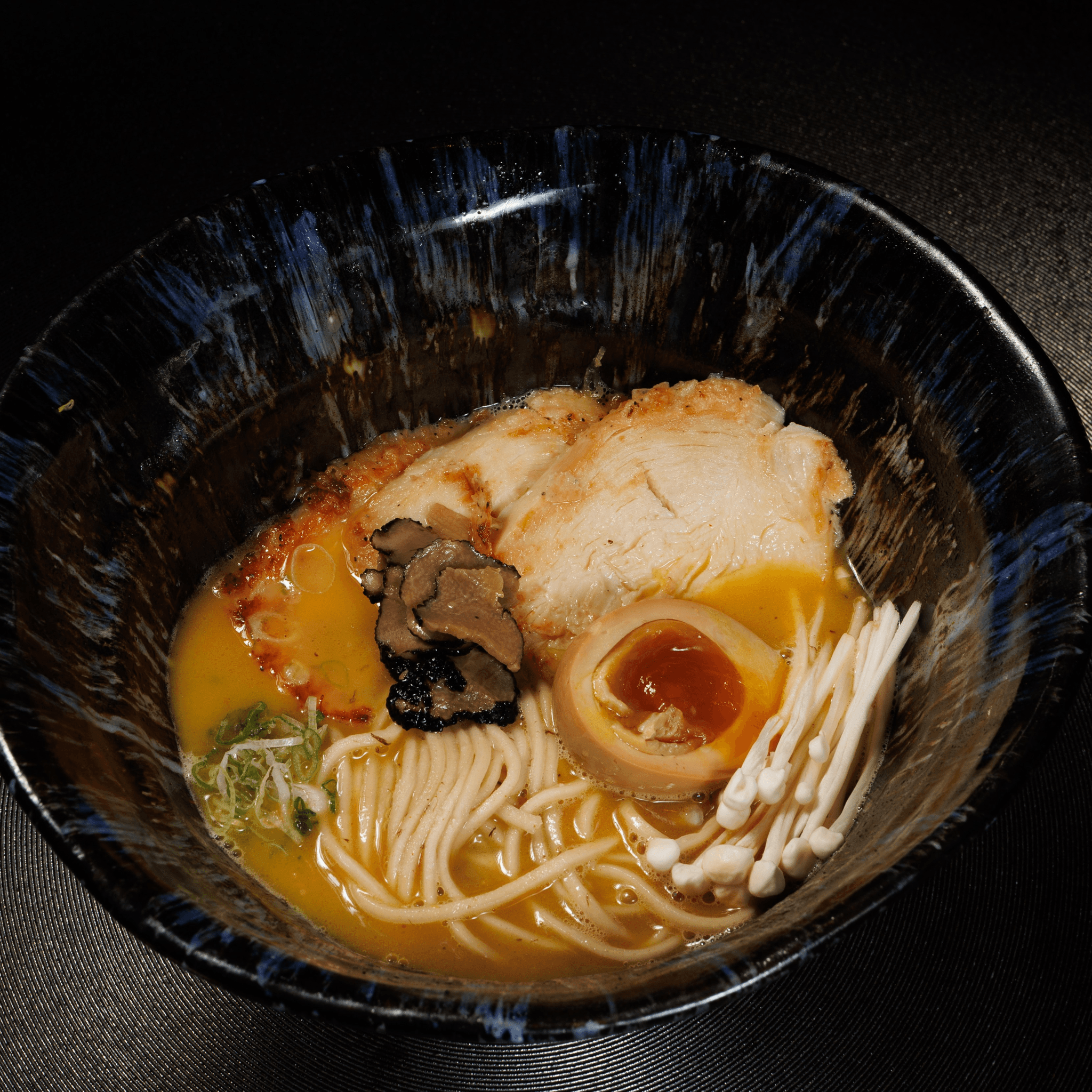 Truffle based chicken broth, truffle peelings, seared chicken breast, scallion, enoki mushroom, soft boiled egg & truffle oil
